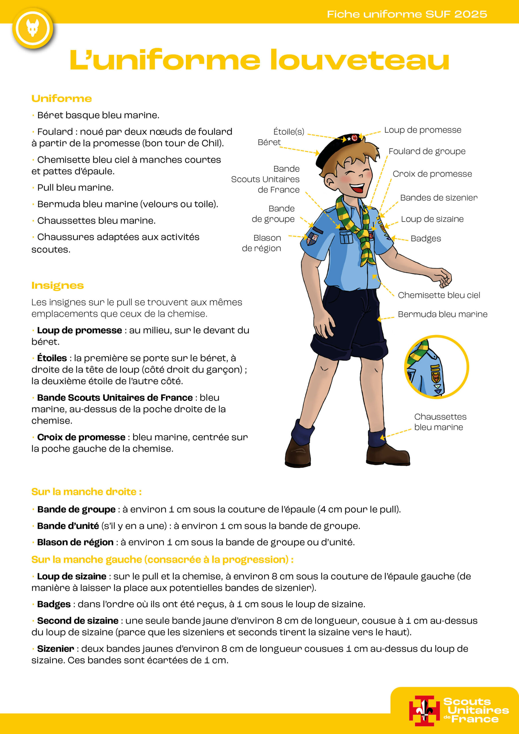 Les garçons de 8 à 12 ans intègrent une meute de louveteaux lors de leurs quatre premières années de scoutisme. Inspiré du célèbre Livre de la Jungle écrit par Rudyard Kipling en 1894, le louvetisme pratiqué chez les SUF s’appuie sur une pédagogie qui tient compte des aspirations et des attentes des jeunes garçons. Ils suivent les maximes et la loi de la meute et apprennent les règles de vie en communauté, sous la responsabilité de cheftaines formées et motivées à les faire grandir.