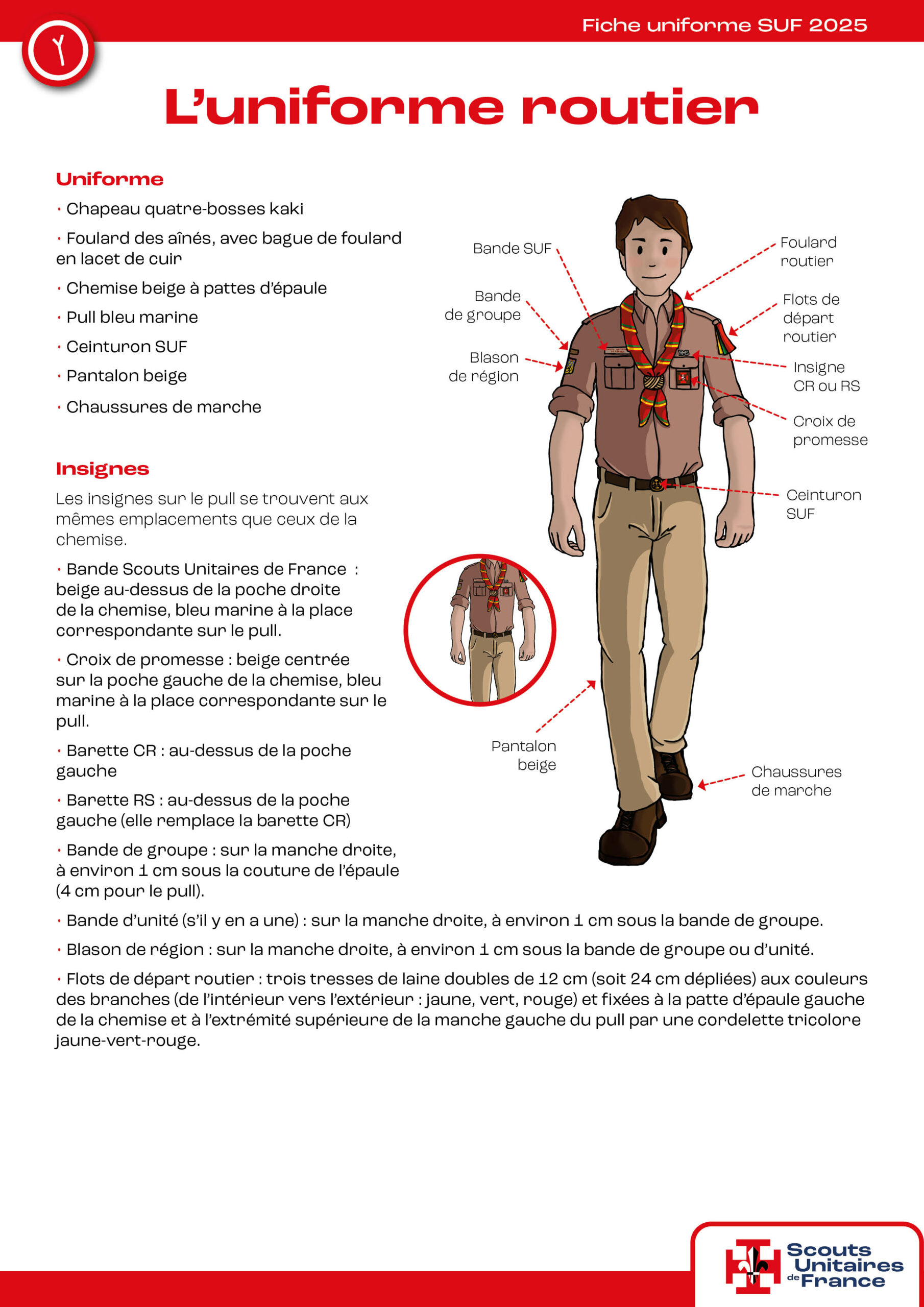 Il est composé d’un pantalon beige, une chemise beige, un pull bleu marine et le foulard d’aîné. Découvre-le ici !